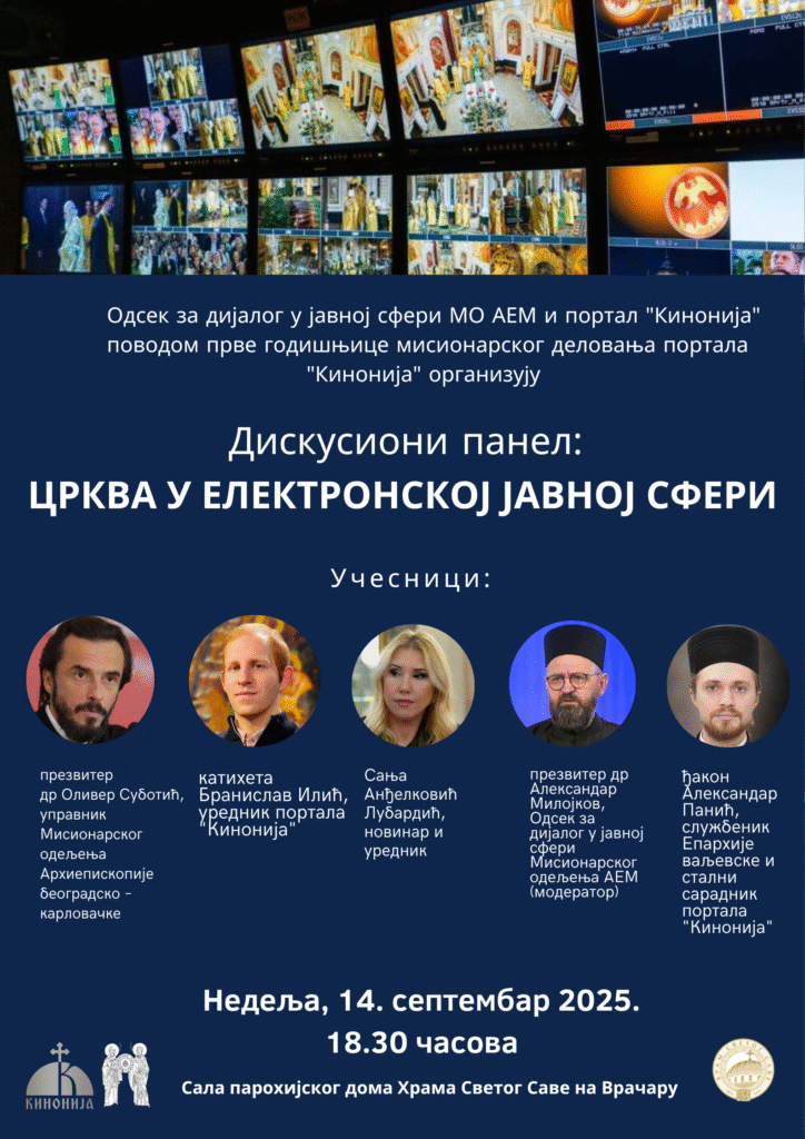 Одсек за дијалог у јавној сфери Мисионарског одељења Архиепископије београдско-карловачке и портал „Кинонија“, поводом прве годишњице мисионарског деловања портала „Кинонија“, организују дискусиони панел на тему: „Црква у електронској јавној сфери“. Панел ће бити одржан у сали парохијског дома Храма Светог Саве на Врачару, у недељу 14. септембра са почетком у 18.30ч.