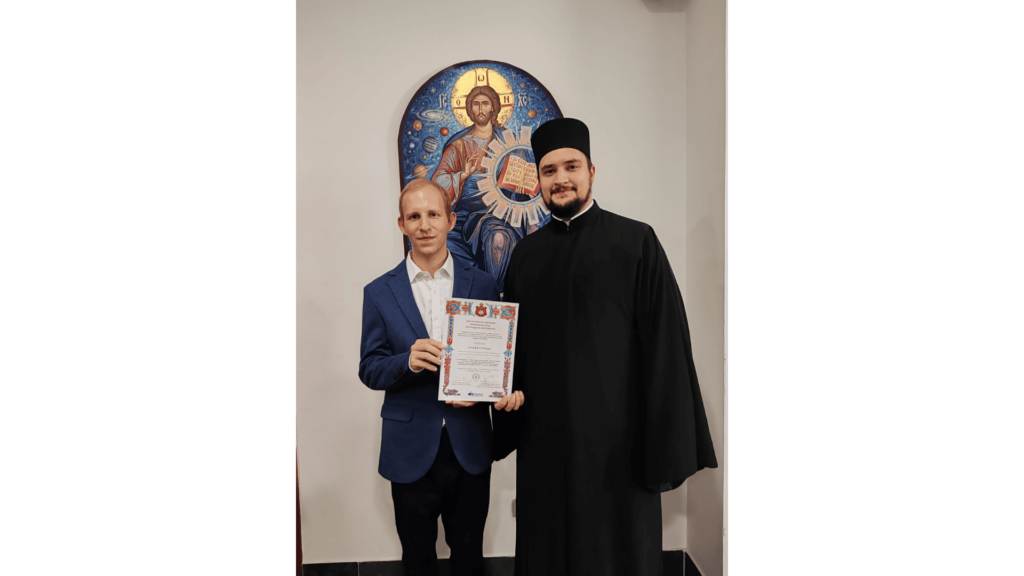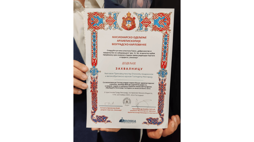 Подсећамо, на свечаном сабрању поводом прве годишњице портала „Кинонија“, које је уприличено у свечаној дворани Парохијског дома Храма Светог Саве на Врачару, 14. септембра 2025. године, Мисионарско одељење Архиепископије београдско-карловачке и портал „Кинонија“, као израз благодарности на плодној мисионарској сарадњи, уручили су захвалницу Његовом Преосвештенству Епископу лондонском и великобританско-ирском г. Нектарију. Том приликом, у име епископа, захвалницу је примио ђакон Филип Миливојевић.