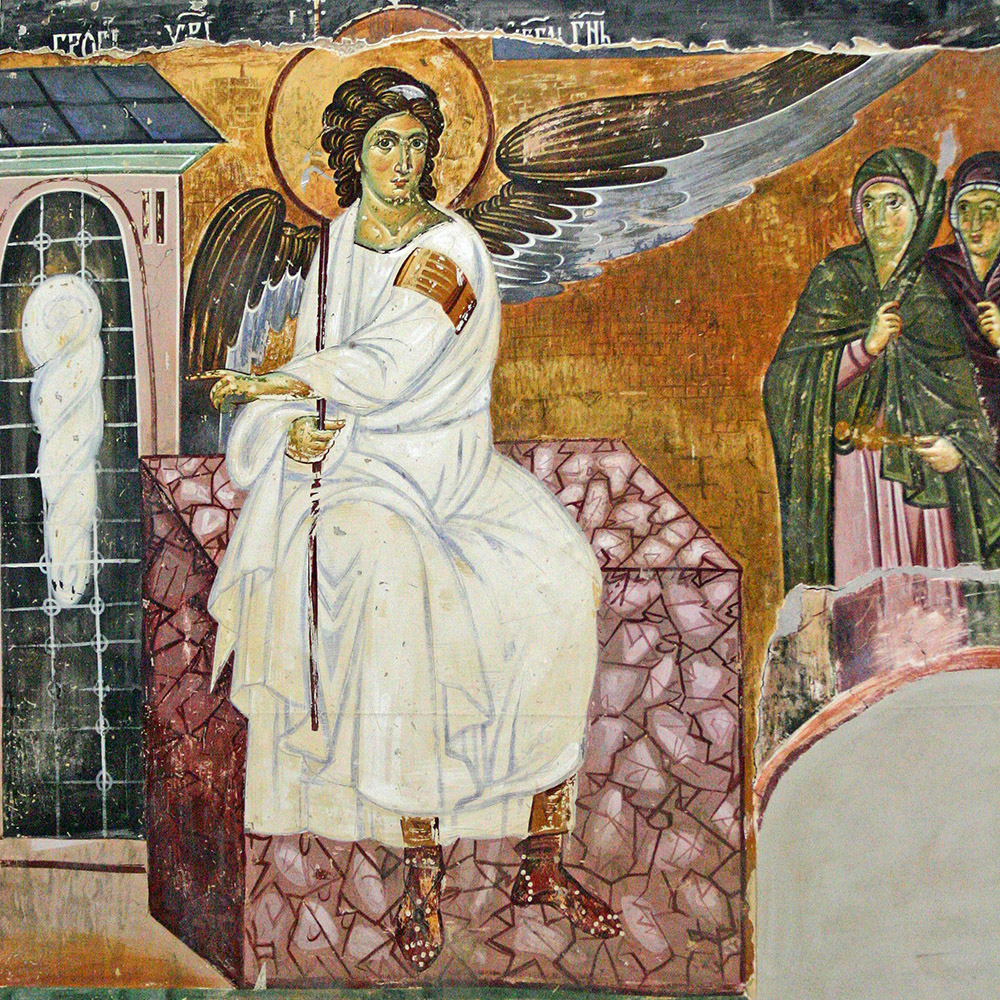Икона Васкрсења Христова може се приказати и кроз тематику Мироносице на Гробу. Ова сцена се први пут појављује у 3. веку у цркви Дура Еуропос. Приказ подразумева изображену гробну пећину са празним гробом и повојем у њему. Иза гроба су мироносице, а на камену седе један или два анђела у белим хаљинама који показују женама где је лежало Христово тело. Једна од најлепших представа ове сцене јесте фреска из манастира Милешеве позната под називом „Бели Анђео”. Према речима Светог владике Николаја: „Гледање белог Анђела, равно је молитви”.