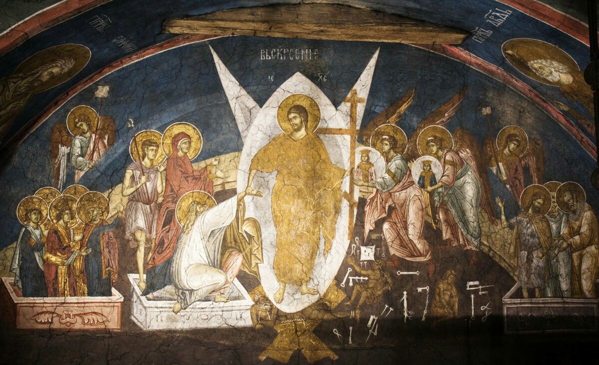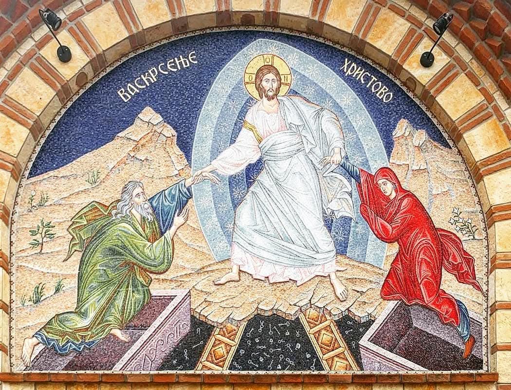 Икона Васкрсења Христова може се приказати у тематици Његовог силаска у ад. Главна тема богослужења на Велику Суботу је управо победа Христова над смрћу и подизање Адама и осталих праведника из трулежи. Свети Епифаније описује задивљујућу Адамову беседу са Христом. Адам је зачуо кораке Христа Који долази, исто као што их је чуо и у рају, после преступа и непослушности. Тада је осетио зебњу и страх, а сада радост и ликовање. Покајани Адам је ускликнуо, обраћајући се свим душама: „Господ мој са свима“, а Господ му је на то одговорио: „И са духом твојим!”