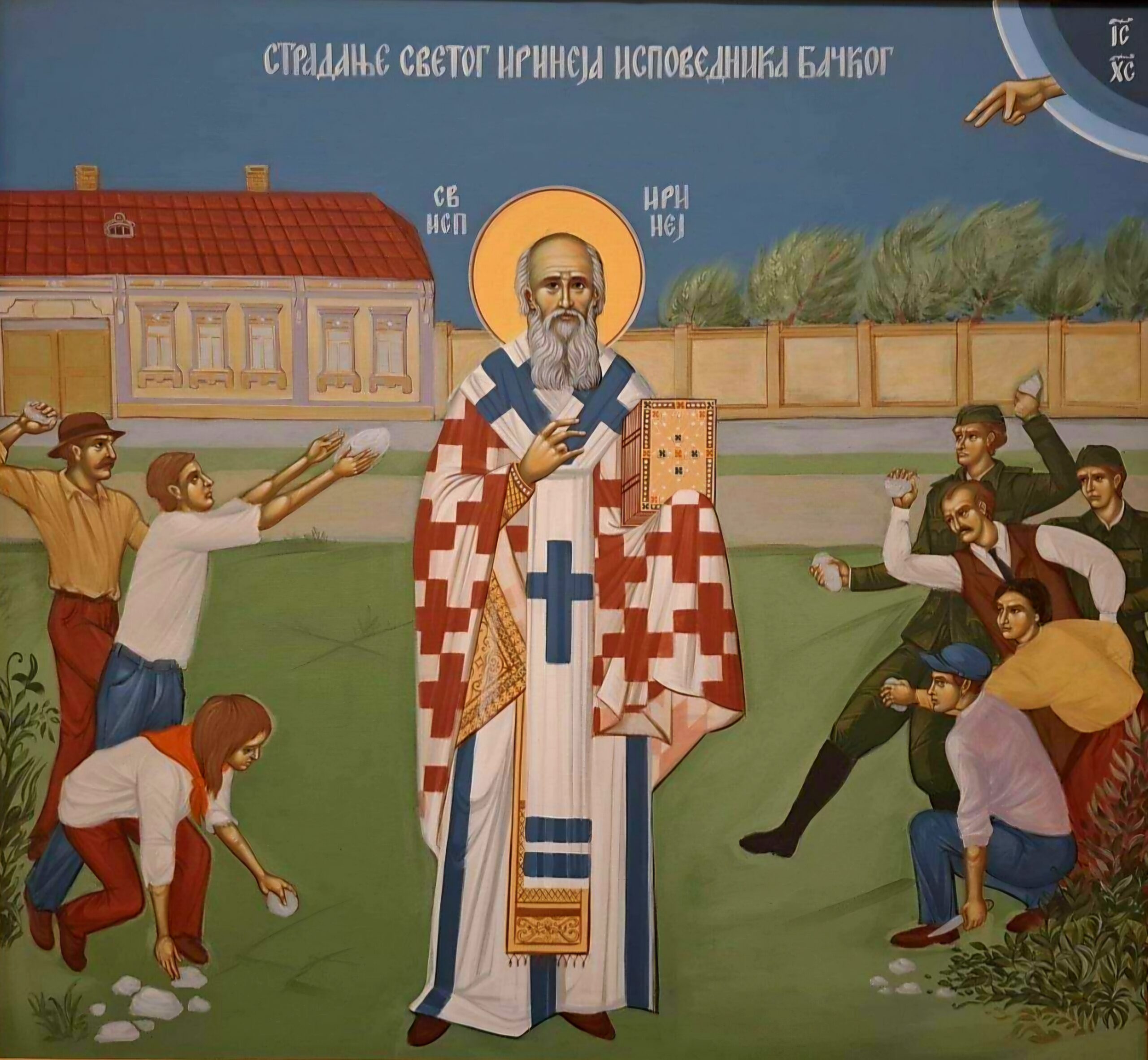 У позадини видимо капелу (кућу) коју је владика требало да освешта уочи празника Преображења Господњег. Капела је осликана на основу фотографије и сведочења да се догађај ту догодио. Приказ људи у униформисаном оделу који каменују владику, јасно одражава околности у којима је Свети владика Иринеј живео и радио. Комунистичка уверења тада су била пренета на већину људи, који су, самим тим, прихватили образац понашања. Зато је насликано да у рукама камење једнако држе и униформисана лица (извршиоци власти) и обични грађани, сељаци и жене. Свети владика Иринеј, као централна личност, приказан је веома достојанствено и смирено, у складу са свим хришћанским врлинама и у складу са оним како је провео цео свој живот: док су се око њега дешавала злодела, он је служио Богу и угроженом народу на сваком месту и у свако време. Свети владика приказан је у владичанском одјејанију, не комплетном.