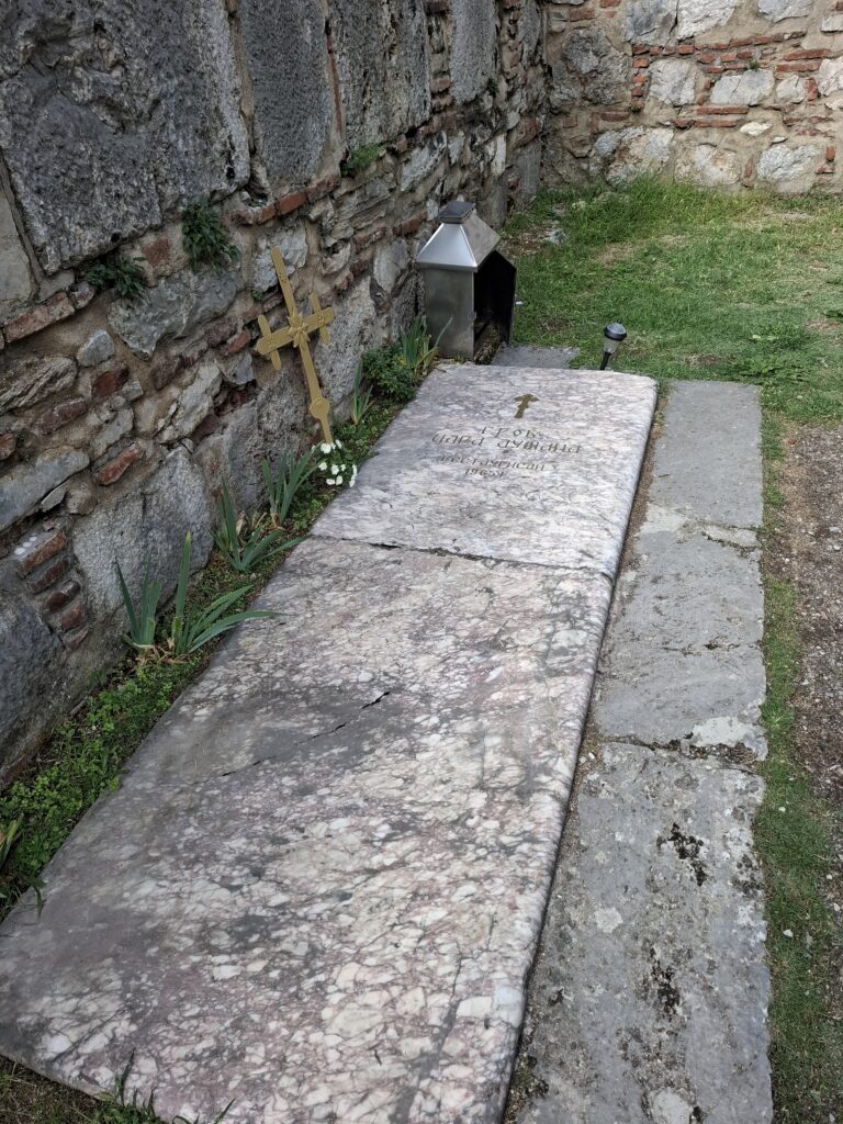 Гробница цара Душана налазла се у северном броду цркве (преминуо 1355) и била је озидана мермером. Поред гробнице уз зид стајала је статуа цара Душана у природној величини. Статуа је касније однесена, а гробница похарана, реликвије покрадене, а кости разбацане. Такве их је испод остатака саркофага пронашао поменути професор Грујић, скупио и сачувао.