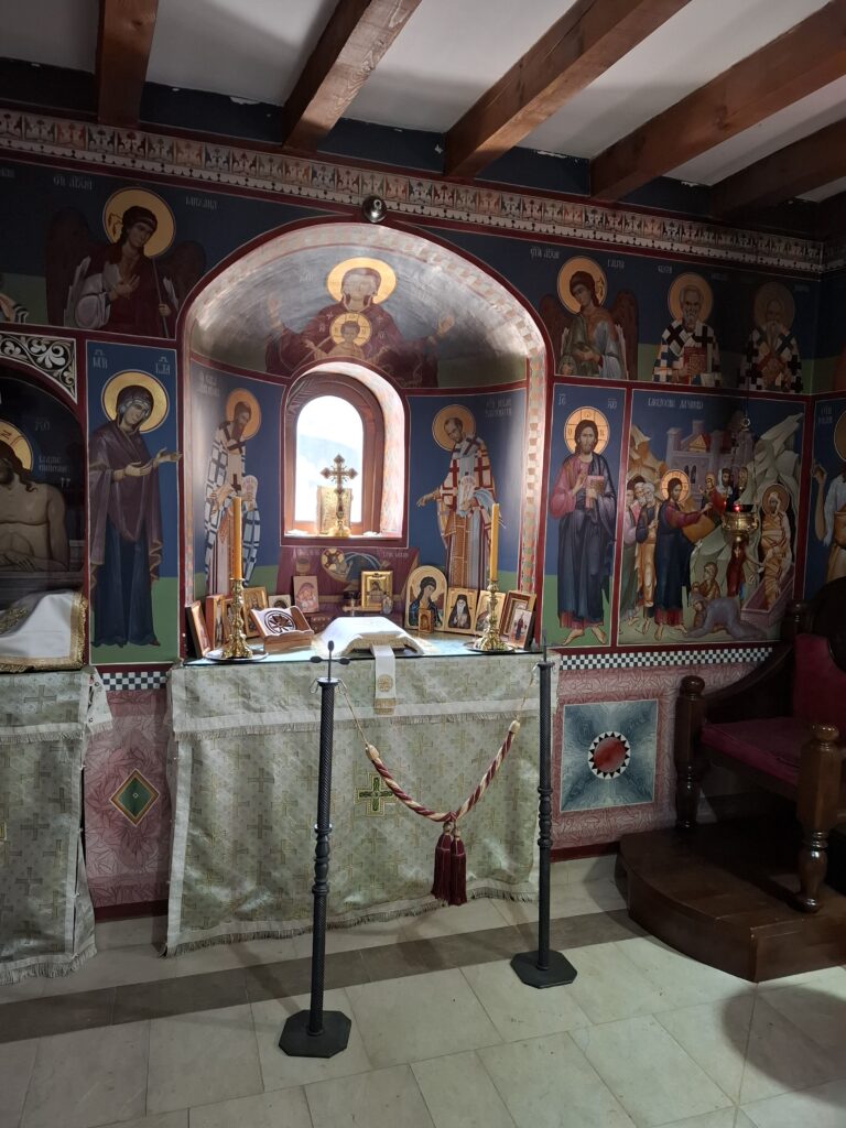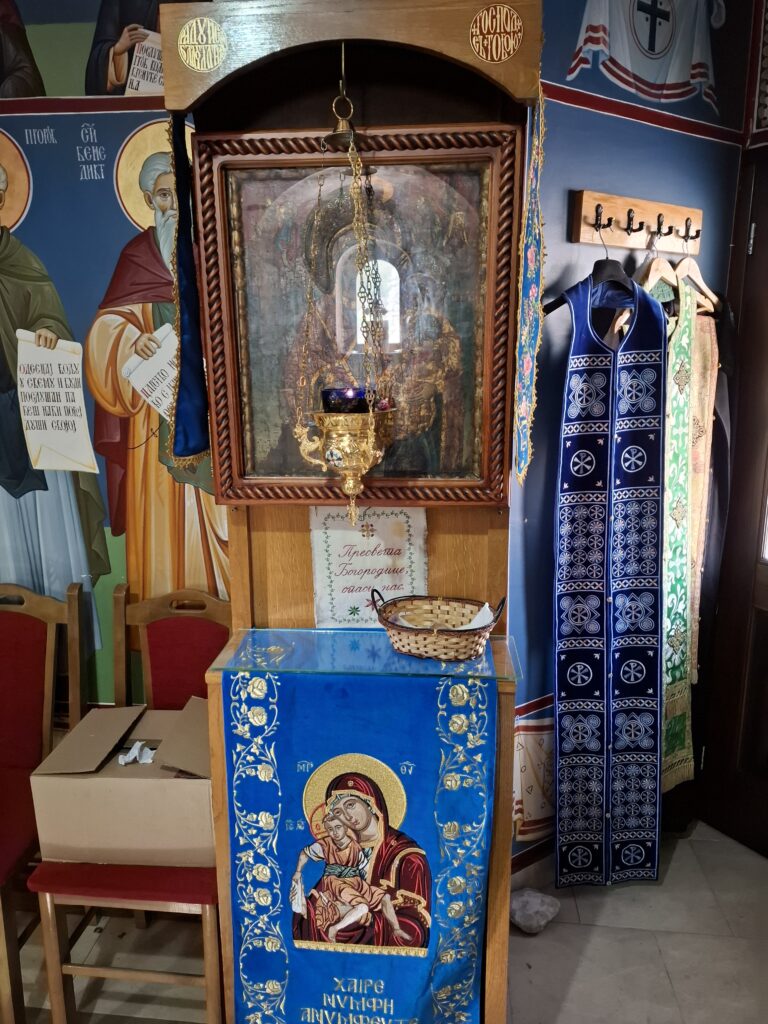 Под је мермерни, на средини део са мозаичком структуром. А две иконе: Икона Призренске Богородице с маленим Христом и икона Сабор светих Архангела, која је поклон верника. Икона Пресвете Богородице с Христом је дивна реликвија, изнад ње је фреска Светог новомученика Харитона, и тако символично указују на вечни живот, на страдање Христа ради.