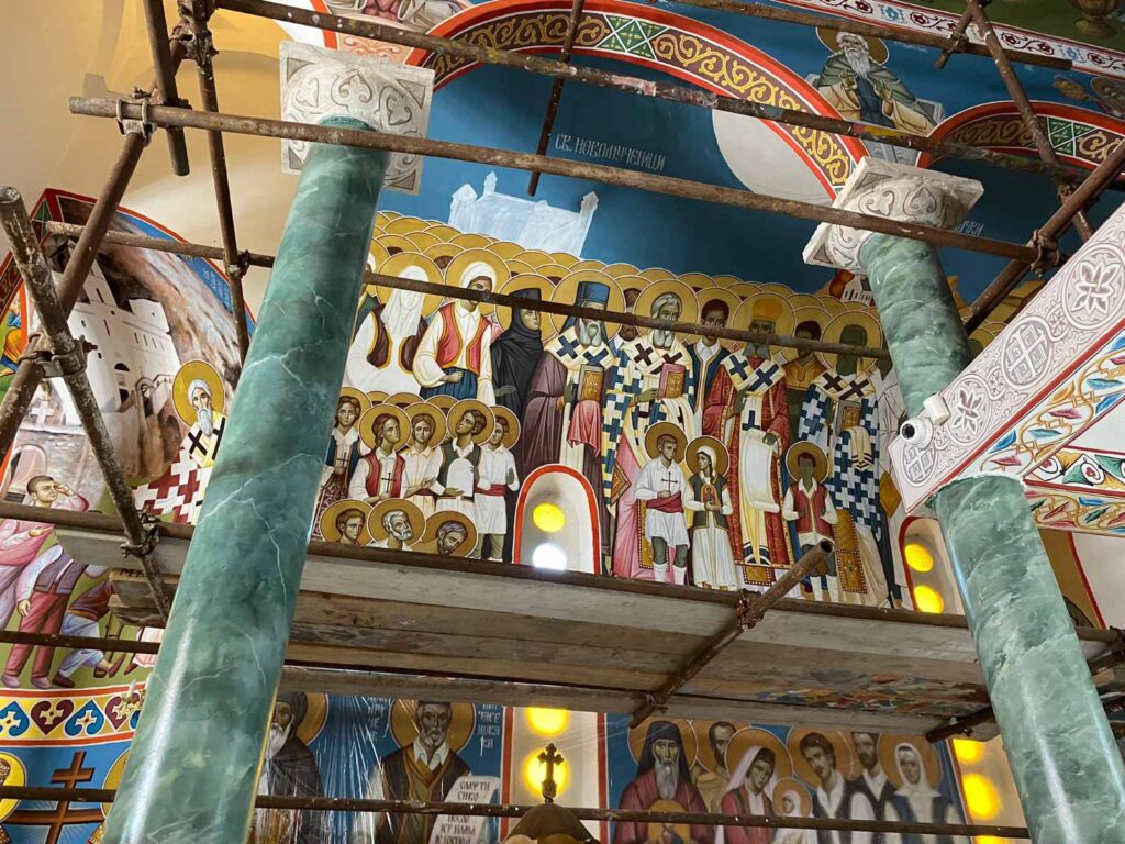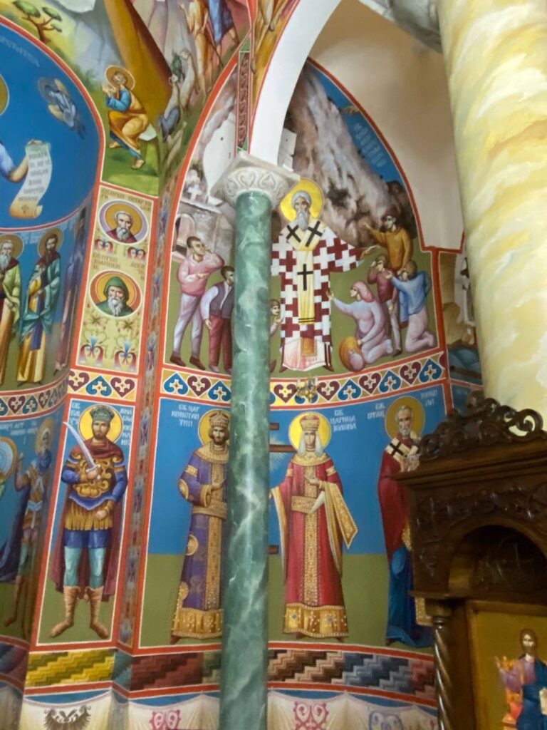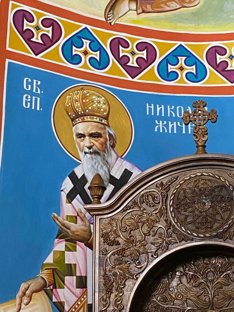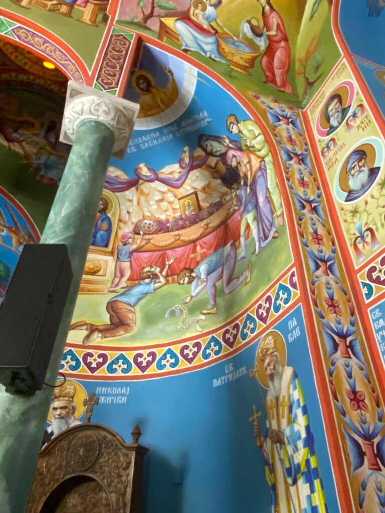 У храму сам затекла скеле и рад на фрескопису, који је опет тако јединствен, да нисам знала коју бих фреску пре фотографисала и којој пре посветила пажњу. Свака у већ препознатљивом стилу, а опет другачија него у другим храмовима, чак је и избор представа на фрескама оплемењујућ. Кроз пространа врата са западне стране води нас складност боја поплочаног дворишта и цркве. Поглед на стубове у боји жада и цитрина, раскошни полијелеј и живописан иконопис, остављају не без даха, већ без вида за овоземаљско. Та вертикала к небу је у овом храму опипљива, оживотворена у сваком лику светитеља са фреске. Фреске Светог Николаја Жичког и патријарха Павла су тако веродостојне у цртама ликова, да сам дуго стајала пред фрескама које су биле верније од фотографија. Налазе се с десне стране олтарског дела изнад иконе и честице моштију Светог Василија Острошког. Текст на свитку у руци Светог Николаја Жичког је из његових ,,Молитви на језеру“ (Теби је име Љубав зато што Ти је име Јединствено Тројство Лепото моја бесмртна). Два светитеља, толико значајна за српски народ, као да стоје с десне стране Творца прилазећи к нама у молитви, да и ми приђемо к њима. Под куполом је фреска Христа Сведржитеља – Пантократор (Владар свега), а на ободима куполе су четири јеванђелиста који обликују квадрат испод круга, а читава црква коцку. Тај византијски стил потиче из времена када је цар Константин дао слободу цркви, у то време су научници сматрали да је земља коцка, а небо округло. ,,Пошто је Христос дошао са неба да уједини небо и земљу – а то је црква коју је он основао, онда добијамо грађевину облика као што су византијски храмови које и ми имамо. А то је доле коцка, а купола округла у којој је Христос Пантократор.