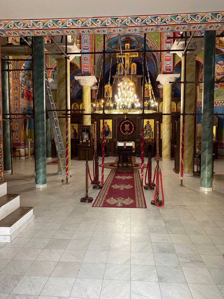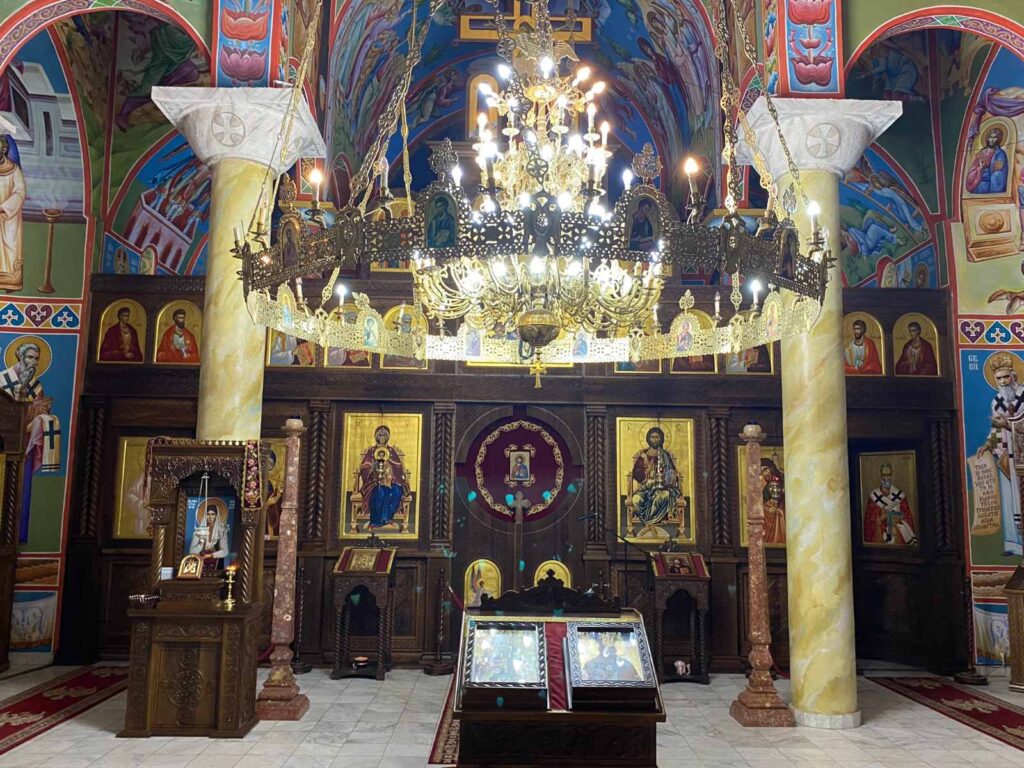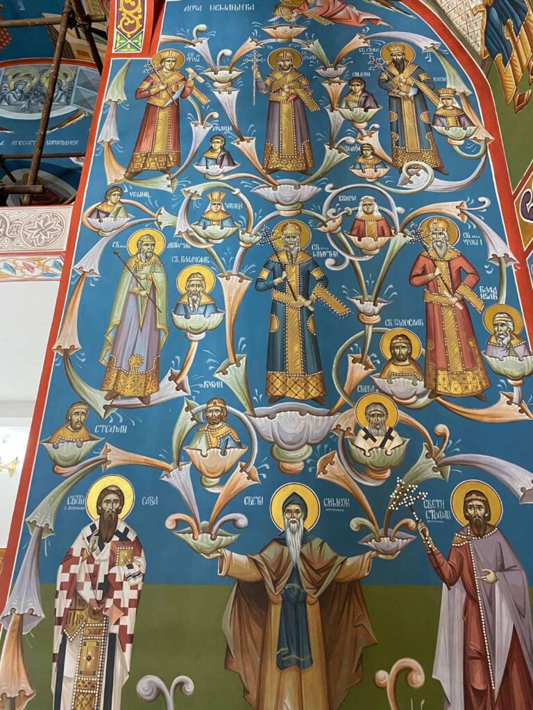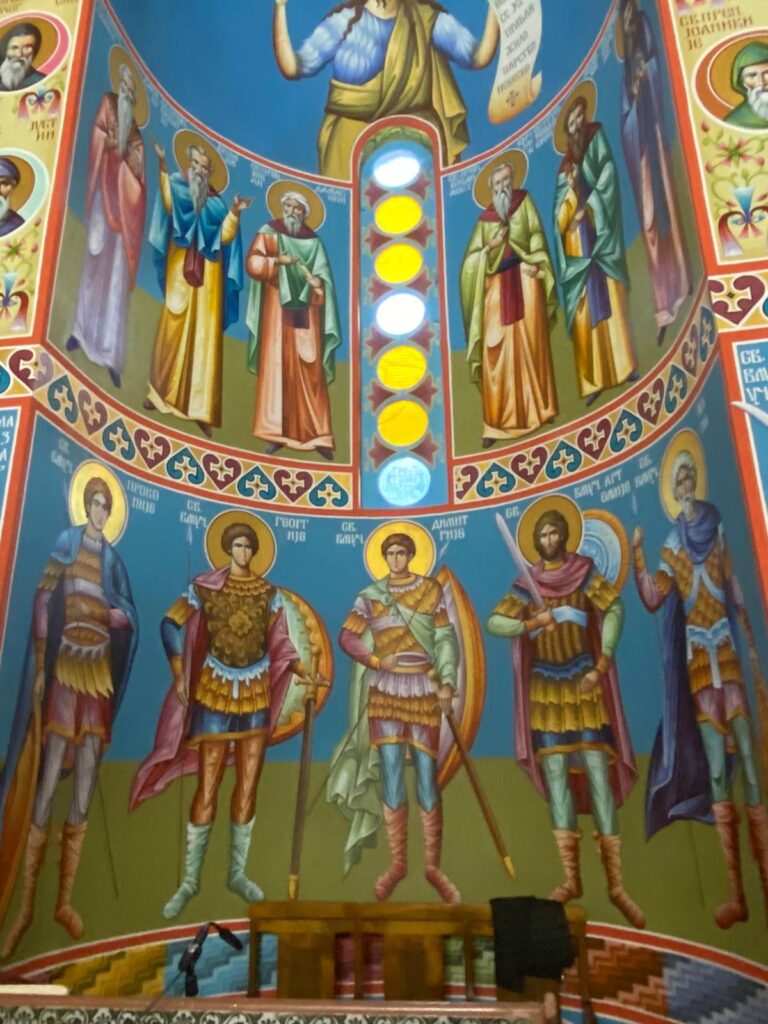 У храму сам затекла скеле и рад на фрескопису, који је опет тако јединствен, да нисам знала коју бих фреску пре фотографисала и којој пре посветила пажњу. Свака у већ препознатљивом стилу, а опет другачија него у другим храмовима, чак је и избор представа на фрескама оплемењујућ. Кроз пространа врата са западне стране води нас складност боја поплочаног дворишта и цркве. Поглед на стубове у боји жада и цитрина, раскошни полијелеј и живописан иконопис, остављају не без даха, већ без вида за овоземаљско. Та вертикала к небу је у овом храму опипљива, оживотворена у сваком лику светитеља са фреске. Фреске Светог Николаја Жичког и патријарха Павла су тако веродостојне у цртама ликова, да сам дуго стајала пред фрескама које су биле верније од фотографија. Налазе се с десне стране олтарског дела изнад иконе и честице моштију Светог Василија Острошког. Текст на свитку у руци Светог Николаја Жичког је из његових ,,Молитви на језеру“ (Теби је име Љубав зато што Ти је име Јединствено Тројство Лепото моја бесмртна). Два светитеља, толико значајна за српски народ, као да стоје с десне стране Творца прилазећи к нама у молитви, да и ми приђемо к њима. Под куполом је фреска Христа Сведржитеља – Пантократор (Владар свега), а на ободима куполе су четири јеванђелиста који обликују квадрат испод круга, а читава црква коцку. Тај византијски стил потиче из времена када је цар Константин дао слободу цркви, у то време су научници сматрали да је земља коцка, а небо округло. ,,Пошто је Христос дошао са неба да уједини небо и земљу – а то је црква коју је он основао, онда добијамо грађевину облика као што су византијски храмови које и ми имамо. А то је доле коцка, а купола округла у којој је Христос Пантократор.