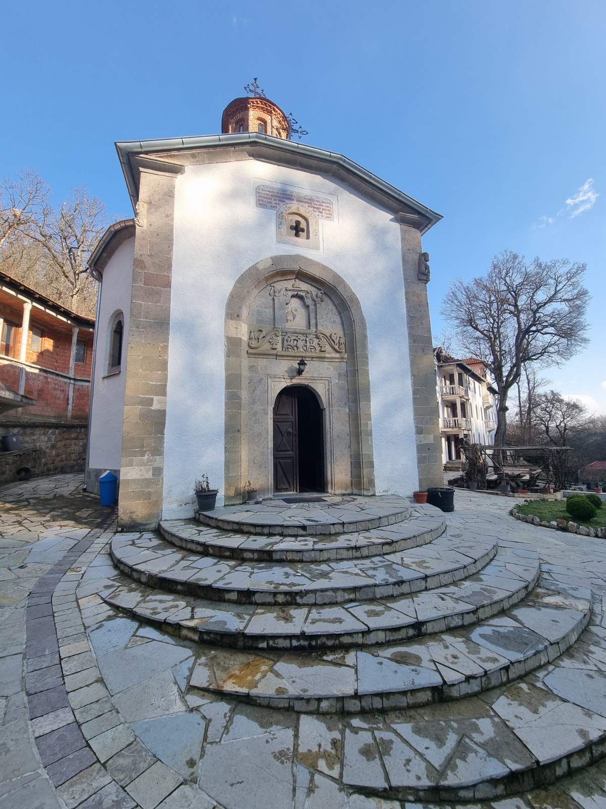 Тачно изнад улаза стоје три посебно исклесана камена блока.