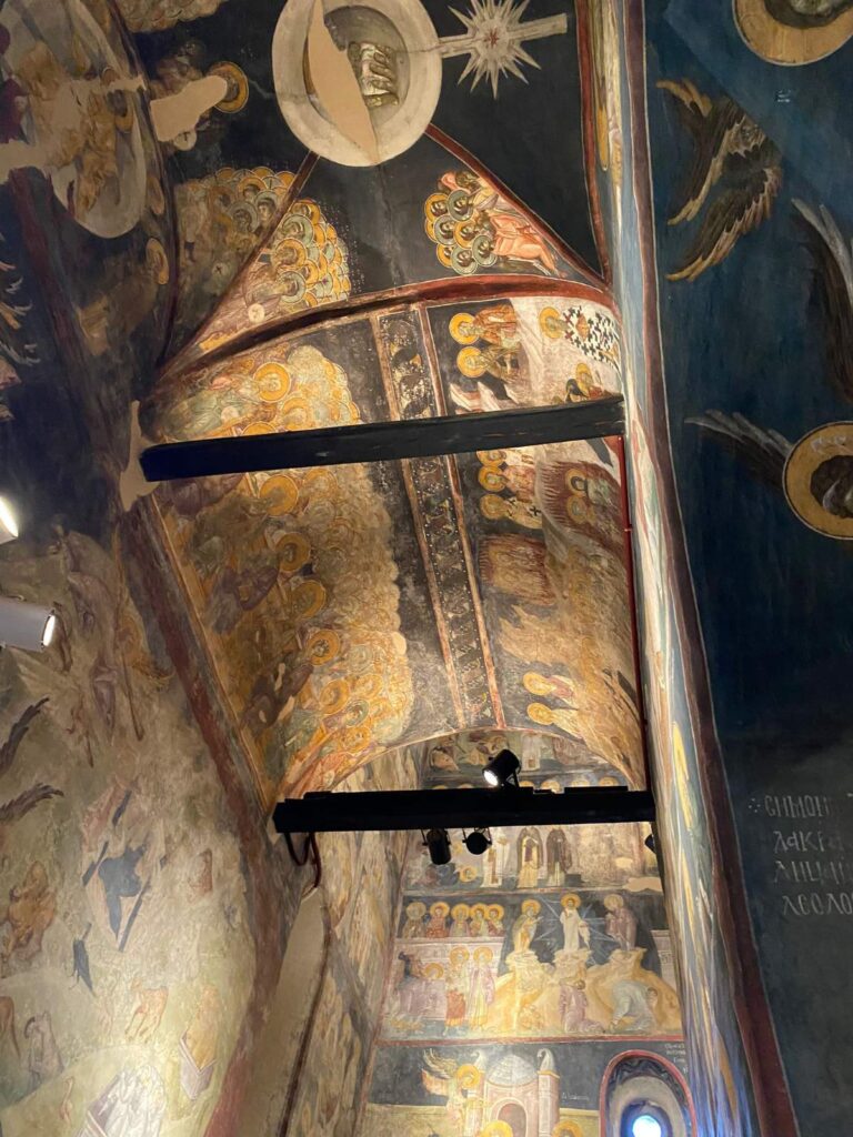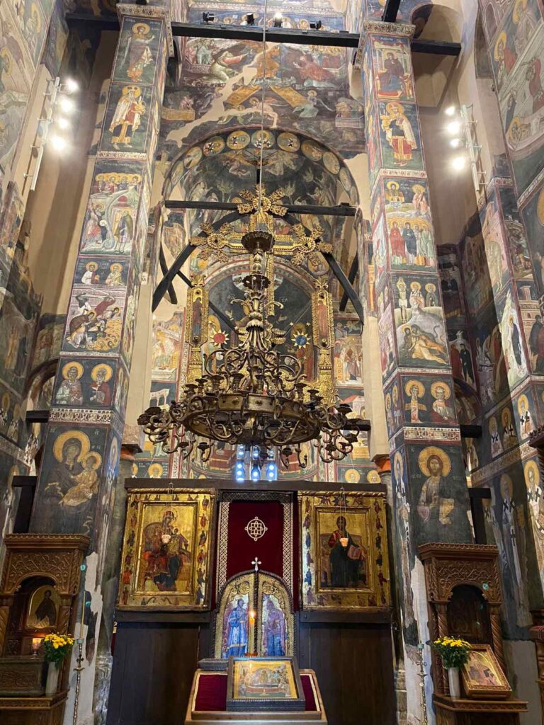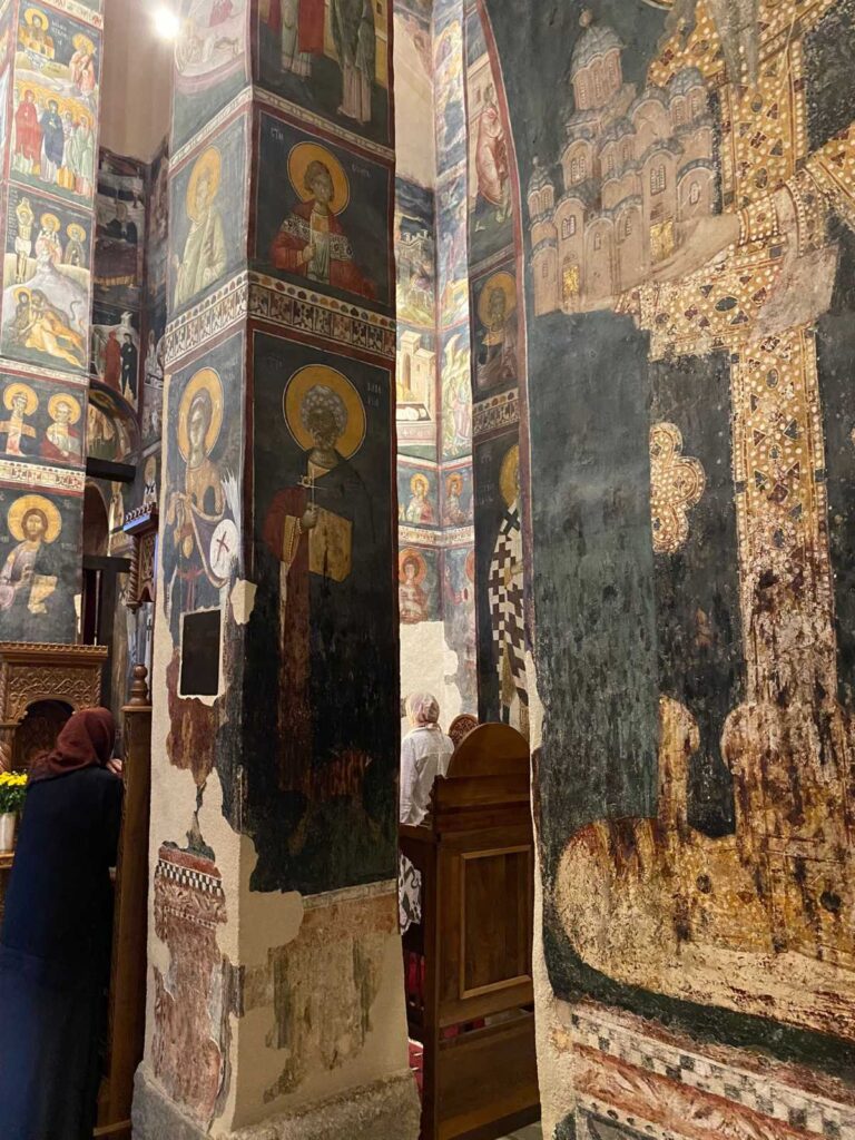 ,,Композиције у наосу посвећене су земном животу Исуса Христа и црквеном календару. Окосницу чини циклус Великих празника, Чуда и Страдања Христових. У унутрашњости припрате налазе се портрети ктитора: краља Милутина и краљице Симониде, затим портрети краљице Јелене, као монахиње, и краља Милутина, као монаха. Посебно је значајна Лоза Немањића и, од родоначелника Немање до краља Милутина. У припрати је опширно илустрован и Страшни суд. У северном параклису налазе се сцене из живота Светог Николе, а у јужном су представе из Старог завета, Богородичиног и Христовог живота. У тој капели је и гроб липљанског епископа Теодора, изнад кога је приказана његова смрт. Мајстори овог сликарства највероватније су дотле већ доказани сликари Михаило и Еутихије, који су радили са већом групом помоћника. У спољашњој припрати сачувана је значајна површина фресака из 1570. године, изведених уз ктиторство патријарха Макарија Соколовића. У припрати је очуван и мањи део сликарства који припада крају XIV и првој половини XV века, и то композиције: Крштење Христово, затим делови Акатиста и Васељенски сабори. Ту су наглашене две основне сликарске теме: прослављање Богородице и Поворка српских архијереја од Светог Саве до патријарха Макарија. У југозападном делу припрате налази се историјска композиција Смрт грачаничког митрополита Дионисија“. (Слободан Милеуснић, ,,Водич кроз Манастире у Србији“, 2007)