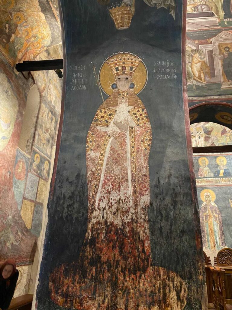 Фрескопис манастира Грачанице је толико задивљујући, да је често био инспирација за уметнике. Солунски сликари Михаило и Евтихије, завршили су живописање овог манастира 1321. године. Већ смо поменули представу Симониде, али и портрет ктитора, краља Милутина, потом и фреску ,,Лоза Немањића“ које остављају дубоки утисак како на историчаре уметности, тако и на сваког посматрача кад закорачи унутар храма. О поменутим портретима, краљице Симониде и краља Милутина, налазимо налазимо да су приказани у тренутку када их крунише Христос. Портрет краља Милутина представљен је као старац са дугом белом, шиљатом брадом, одевен у византијску царску одежду и са царском круном на глави, док стоји на црвеном јастуку украшеном двоглавим орловима и представља царски симбол. У рукама држи цркву, а о томе постоје подаци у житију које је написао архиепископ Данило. Данило наводи да је црква била посвећена Благовестима, док је у каснијим изворима она била посвећена Успењу Богородице и поред Грачанице наводи и друге цркве чије се ктиторство приписује краљу Милутину. У књизи ,,Водич кроз манастире у Србији“ аутора Слободана Милеуснића, долазимо до података да у цркви манастира Грачанице постоје три врсте сликарства, у наосу је најраније, с у спољној припрати налазе се два млађа.