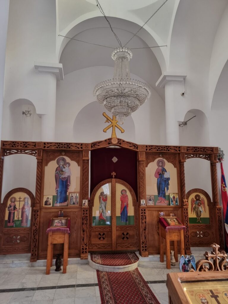 Између аналоја и олтарске преграде са плафона виси кристални полијелеј, чак наличи свечаним старинским кристалним лустерима, какви су могли да се нађу у војвођанским дворцима.